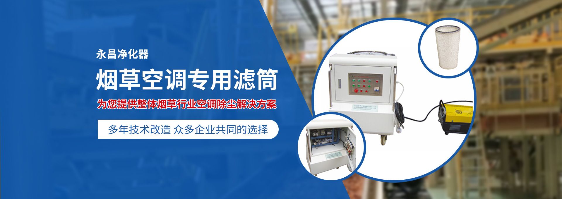 新鄉市永昌凈化器有限公司是生產煙草行業空調除塵專用濾筒的企業。注冊資金1000萬元。已通過ISO9001國際質量管理體系認證。對產品有嚴格的管理制度和售后服務。我公司以誠信、負責、守信譽、重質量的精神所生產的產品,近幾年來在煙草行業受到廣泛應用,并受到用戶的一致好評。  從一九九四年以來為煙廠的空調設備服務。十幾年來,我們不斷走出去請進來學習新技術。定期到用戶那里咨詢情況:互相交流,認真聽取寶貴意見,不斷提高產品質量。從經濟和安全,方便的角度出發,根據煙廠濕度大的生產環境和濾筒收集到的含酸堿、氧化劑的粉塵。在空調箱工作狀態下我們頂著巨大的風壓危險在箱內停留了幾分鐘,認真查看濾筒工作情況,發現濾筒有并死狀態,造成濾筒不過濾、不過風、壓差高的現象。經幾十次試驗分析,在標本兼治的原則下,有針對性的解決了這一問題?! ∥夜踞槍煆S制絲、卷接包、混絲間、儲絲房、冷卻床、梗膨化等不同的生產環境,